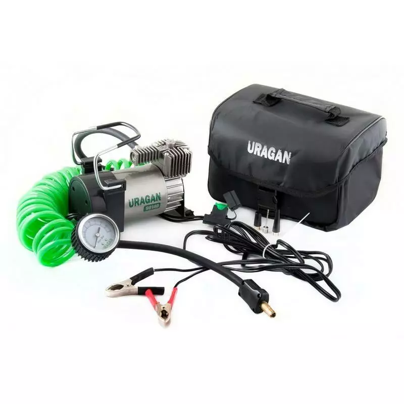 Автокомпрессор однопоршневой на клеммы АКБ URAGAN спиральный шланг автомобильный компрессор для шин R13-R17 10Атм 40 л/мин 200Вт (90140)