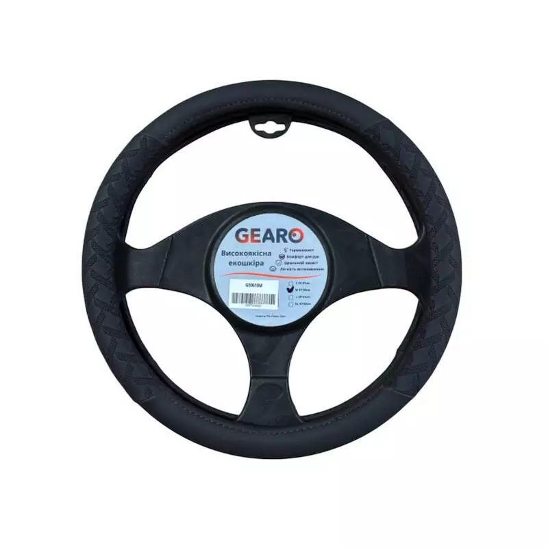 Чехол на руль Gearo из экокожи с узором черный размер M (GE0610M) – это стильное и практичное решение для защиты руля и повышения комфорта при вождении. Благодаря качественным материалам и продуманной конструкции он надежно фиксируется на рулевом колесе, улучшая сцепление и делая управление автомобилем более удобным. Такой аксессуар станет отличным выбором для автолюбителей, которые ценят надежность, эстетику и долговечность.
