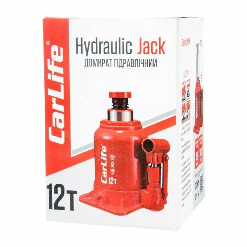 Домкрат гидравлический бутылочный 12т CarLife 190-365мм для автомобиля в картонной упаковке (BJ412S)