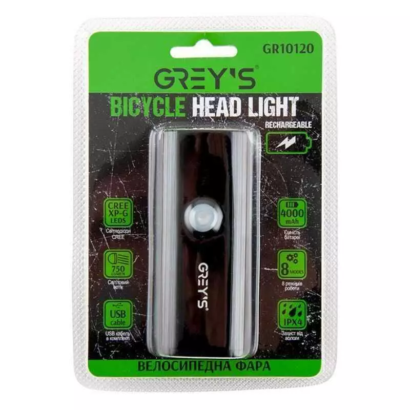 Фара на велосипед на руль 750Lm Grey's 4000mAh IPX4 8 режимов до 30 часов работы (GR10120)