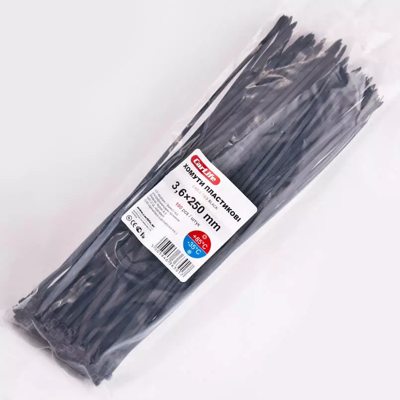 Хомуты Carlife изготовлены из пластика, который обладает прочностью, пластичностью, устойчивостью к горючим веществам, разрушению и старению. Одним из преимуществ пластиковых хомутов является широкий диапазон температур, при которых они могут использоваться, а именно от -35 до +85°C. Минимальная температура, при которой допускается монтаж хомутов, составляет -10°C, при температуре ниже не рекомендуется устанавливать стяжки так это может в дальнейшем сказаться на качестве фиксации. Пластик, из которого изготовлены хомуты, обладает высокой гибкостью, что позволяет фиксировать даже тонкие провода, так как минимальный диаметр петли составляет несколько миллиметров.