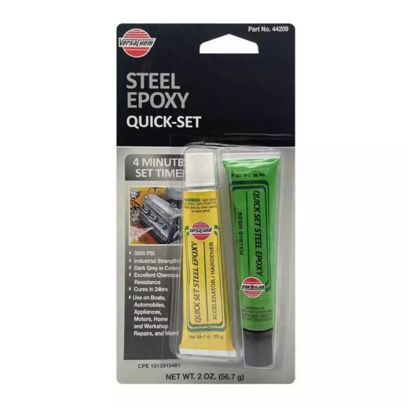 Эпоксидный стальной клей 4 минуты Versachem 4 Minute Steel Epoxy 56.7 г – это быстродействующая промышленная эпоксидная смола, которая отлично подходит для соединения металла с металлом или ремонта дефектов в металле, дереве и кирпичной кладке. После полного затвердения сталь-подобной массы ее можно подвергать ударным нагрузкам, шлифовки, окрашивать.