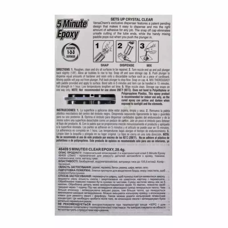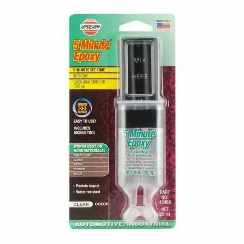 Эпоксидный клей 5 минут Versachem 5 Minute Clear Epoxy 25 мл – двухкомпонентная, быстро твердеющая эпоксидная смола общего назначения, которая высыхает. Эта высокопрочная формула образует постоянную связь практически с любым материалом. Используйте его для соединения металла, дерева, хрома, бетона, стекла, керамики, стекловолокна, фарфора и многого другого.