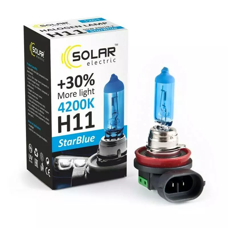 В производстве данных ламп применяются инновационные технологии с использованием высококачественным материалов и производством лучших продуктов. Галогеновая противотуманная лампа Solar H11 12V 55W PGJ19-2 StarBlue 4200K (1261_H) соответствуют высочайшим стандартам качества OEM, что позволяет вам максимально уверенно и эффективно передвигаться в темное время суток.