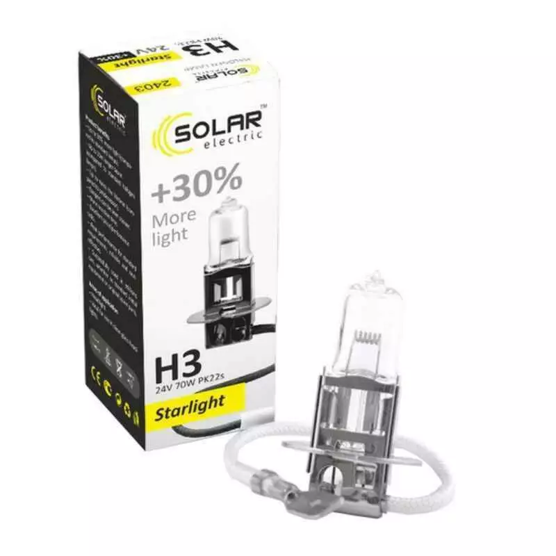 Галогеновая лампа SOLAR H3 +30% 24V 2403 – данное световое решение для водителей, которые ищут баланс между ценой и качеством и при этом не хотят переплачивать за бренд. Галогеновая лампа SOLAR H3 +30% 24V 2403 обладает прекрасными характеристиками и является прекрасным решением для замены вашей штатной галогеновой лампочки. Прекрасно устанавливается в штатные места и эффективно работает на протяжении заявленного срока службы.