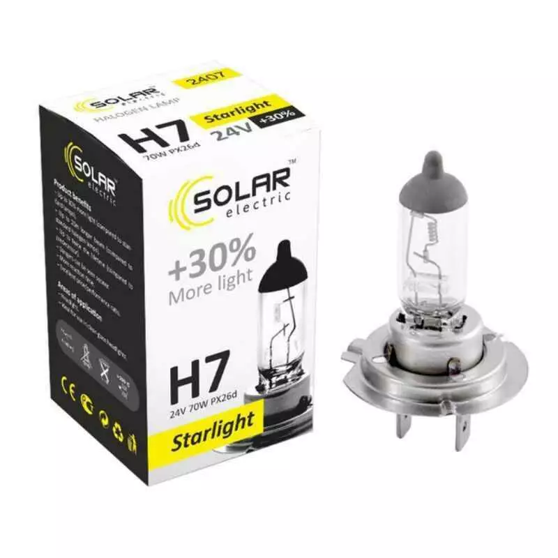 Галогеновая лампа SOLAR H7 +30% 24V 2407 – данное световое решение для водителей, которые ищут баланс между ценой и качеством и при этом не хотят переплачивать за бренд. Галогеновая лампа SOLAR H7 +30% 24V 2407 обладает прекрасными характеристиками и является прекрасным решением для замены вашей штатной галогеновой лампочки. Прекрасно устанавливается в штатные места и эффективно работает на протяжении заявленного срока службы.