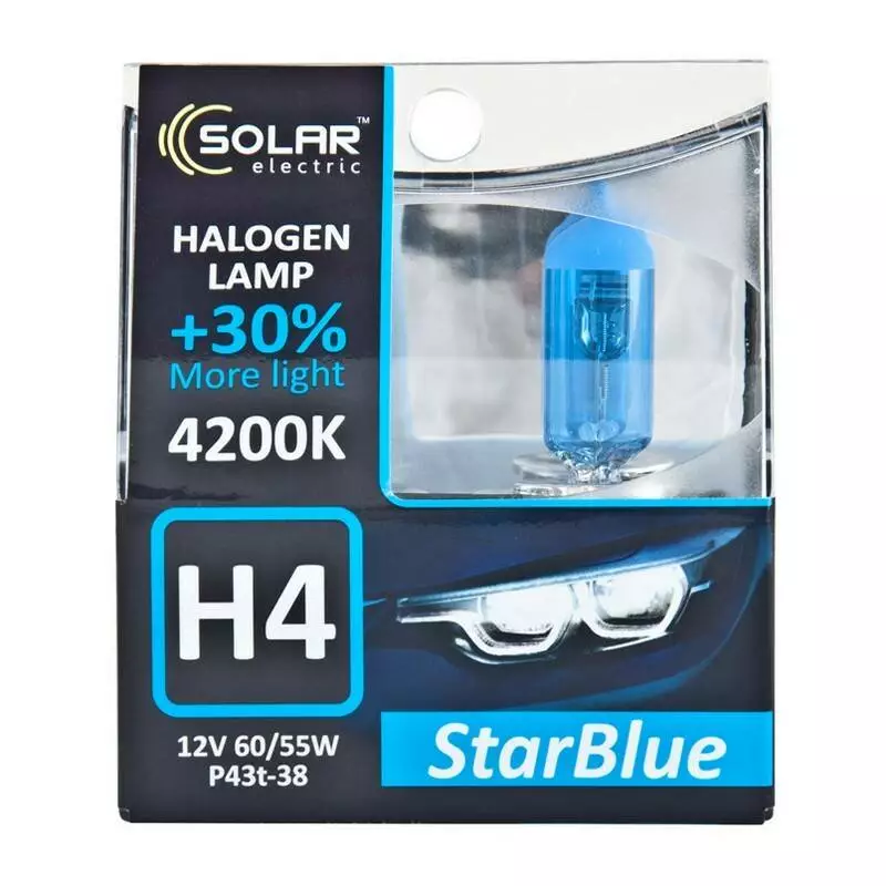 В производстве данных ламп применяются инновационные технологии с использованием высококачественным материалов и производством лучших продуктов. Галогеновая противотуманная лампа Solar H4 12V 60/55W P43t-38 StarBlue 4200K (1244S2) соответствуют высочайшим стандартам качества OEM, что позволяет вам максимально уверенно и эффективно передвигаться в темное время суток.