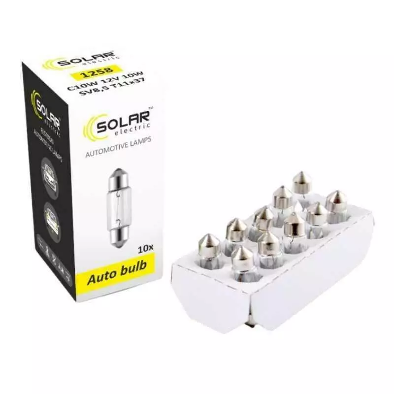 Это лампочка накаливания от компании SOLAR, создана для замены заводского света и обеспечивает полное освещение внутри автомобиля. Сохраняет стабильную световую мощность на всем протяжении срока эксплуатации. Применяются в освещении для салона, приборной панели, багажника и бардачка. Свет яркий но комфортный для глаз без мерцания. Конструкция корпуса более устойчивая к вибрациям и механическим повреждениям, а также с хорошей теплопроводностью, тем самым увеличивается срок службы. Размер стандартный, диаметр 11 мм и длина 37 мм, соответствует посадочному месту. Установка таких лампочек очень проста, Вы это можете сделать самостоятельно, в домашних условиях, главное не притрагиваться к колбе лампочки, что бы не оставлять отпечатки пальцев, а так же желательное её предварительно протереть спиртом.