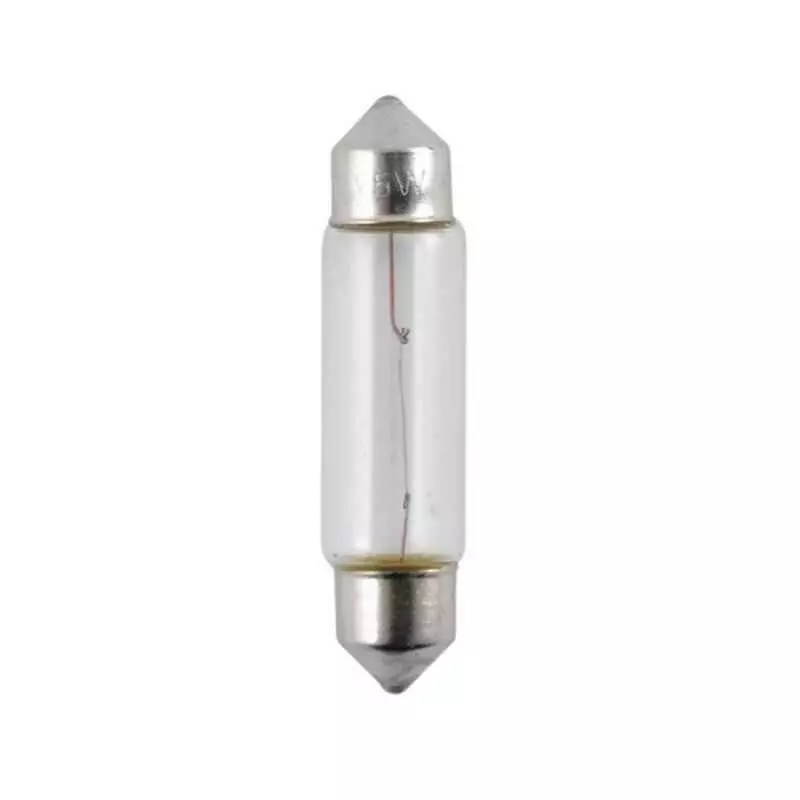 Лампочка накаливания с не окрашенной колбой, излучает яркий белый свет. Потребляемая мощность в 5 Вт, дает достаточно хорошое свечение. Тип лампочки C5W/SV8.5-8 или Festoon, это двухцокольные. Нить накаливания представленная в виде одной спирали. Угол рассеивания света 360 градусов. Предназначены для замены заводского света в автомобили с напряжением бортовой сети 12 В, это легковые автомобили и мотоциклы.