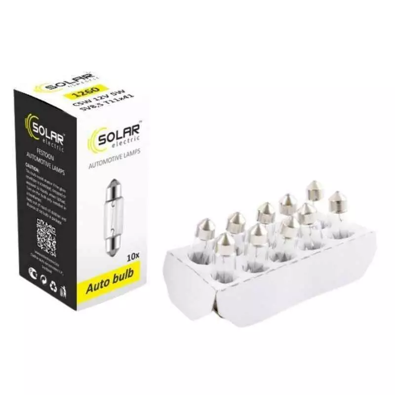 Это лампочка накаливания от компании SOLAR, создана для замены заводского света и обеспечивает полное освещение внутри автомобиля. Сохраняет стабильную световую мощность на всем протяжении срока эксплуатации. Применяются в освещении для салона, приборной панели, багажника и бардачка. Свет яркий но комфортный для глаз без мерцания. Конструкция корпуса более устойчивая к вибрациям и механическим повреждениям, а также с хорошей теплопроводностью, тем самым увеличивается срок службы. Размер стандартный, диаметр 11 мм и длина 41 мм, соответствует посадочному месту. Установка таких лампочек очень проста, Вы это можете сделать самостоятельно, в домашних условиях, главное не притрагиваться к колбе лампочки, что бы не оставлять отпечатки пальцев, а так же желательное её предварительно протереть спиртом.