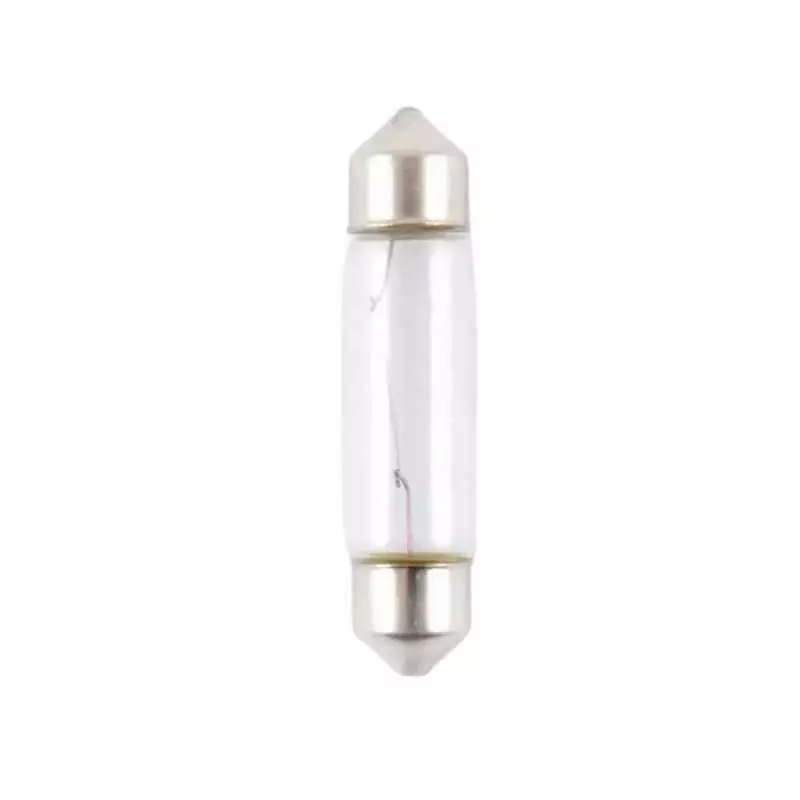 Лампочка накаливания с не окрашенной колбой, излучает яркий белый свет. Потребляемая мощность в 10 Вт, дает достаточно хорошое свечение. Тип лампочки C10W/SV8.5-8 или Festoon, это двухцокольные. Нить накаливания представленная в виде одной спирали. Угол рассеивания света 360 градусов. Предназначены для замены заводского света в автомобили с напряжением бортовой сети 12 В, это легковые автомобили и мотоциклы.