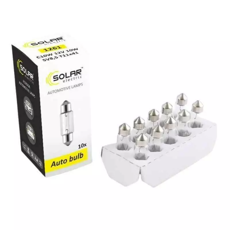 Это лампочка накаливания от компании SOLAR, создана для замены заводского света и обеспечивает полное освещение внутри автомобиля. Сохраняет стабильную световую мощность на всем протяжении срока эксплуатации. Применяются в освещении для салона, приборной панели, багажника и бардачка. Свет яркий но комфортный для глаз без мерцания. Конструкция корпуса более устойчивая к вибрациям и механическим повреждениям, а также с хорошей теплопроводностью, тем самым увеличивается срок службы. Размер стандартный, диаметр 11 мм и длина 41 мм, соответствует посадочному месту. Установка таких лампочек очень проста, Вы это можете сделать самостоятельно, в домашних условиях, главное не притрагиваться к колбе лампочки, что бы не оставлять отпечатки пальцев, а так же желательное её предварительно протереть спиртом.