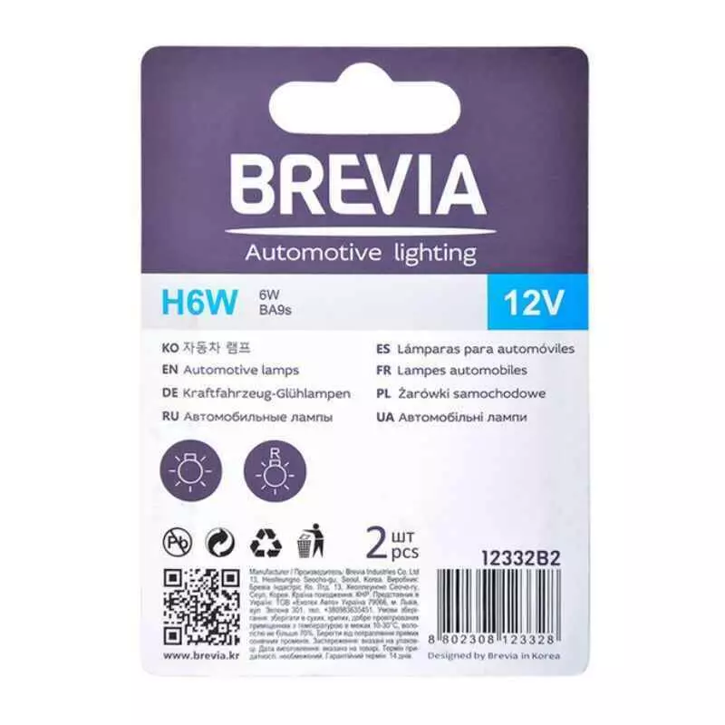 Лампы галогенные цоколь BA9s Brevia H6W 12V 2шт (12332B2)