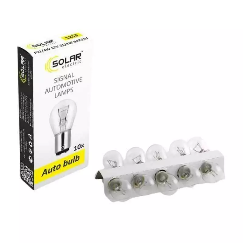 Это лампочка накаливания от компании SOLAR, послужат хорошей заменой старым лампочкам и главное преимущество, это надежность и долговечность. Выдерживают экстремальные нагрузки и вибрацию. Установка достаточно проста, не занимает много времени и усилий, не требует навыков электрика. Размеры стандартные, соответствуют стандартам посадочных мест. Тип лампы P21/4W, используются во внешнем освещении, для подсветки номерного знака, фонаря заднего хода, указателя заднего и переднего поворота, задних противотуманных фар и стоп-сигнала. При ярком излучении они помогают своевременно сообщить о своих намерениях другим участникам дорожного движения, во избежании аварийных ситуаций и обозначают Ваш автомобиль для других участников дорожного движения. Колба неокрашенная, прозрачная, изготовлена из качественного стекла.