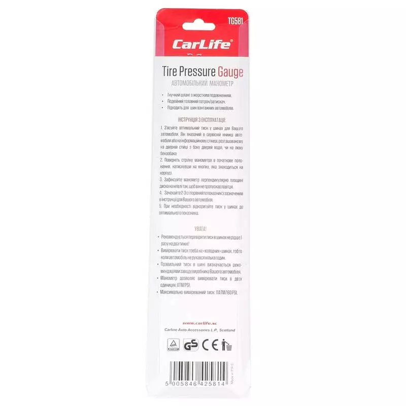 Манометр Carlife TG581 – специальный измерительный прибор, предназначенный для измерения давления в шинах как легковых, так и грузовых автомобилей. Данный прибор позволит постоянно соблюдать оптимальное давление в шине, позволяющее предотвратит чрезмерный износ резины и улучшить стойкость автомобиля на дорогой, обеспечивая при этом комфортную и безопасную езду.