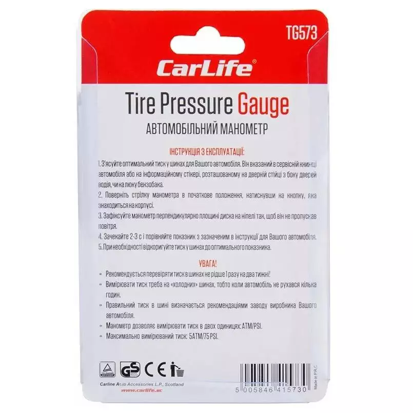Манометр автомобильный для шин CarLife TG573 5 атм