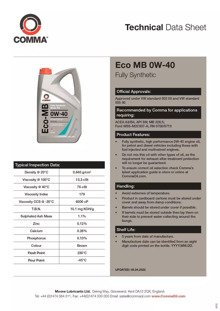 Моторное масло Comma ECO-MB 0W-40 API SN, ACEA A3/B4 5л (4шт/уп)