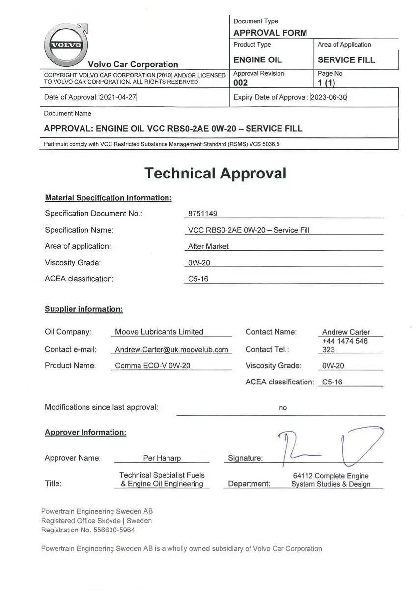 • Допуски ОЕМ: Volvo VCC RBS0-2AE