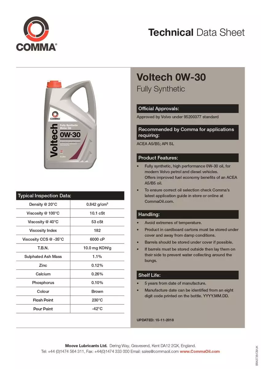 Моторное масло Comma VOLTECH 0W-30 API SL; ACEA A5/B5 1л (12шт/уп)