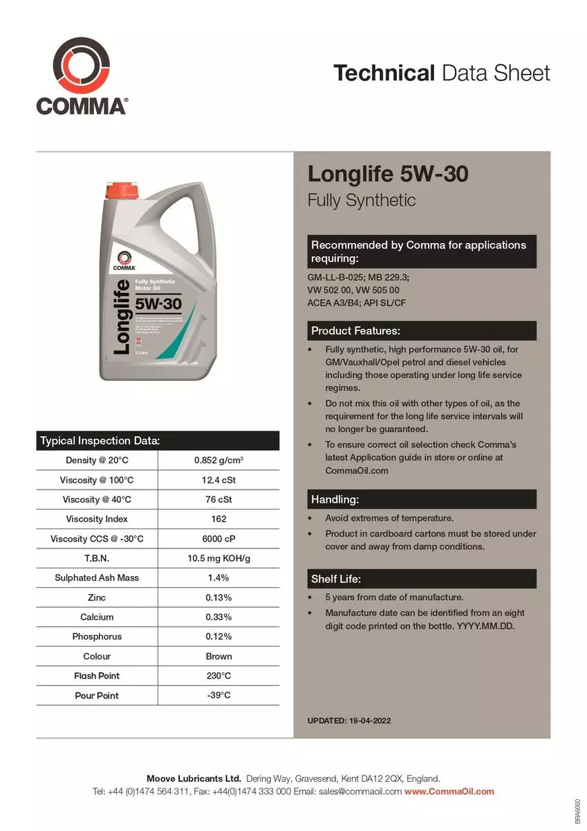 Моторное масло Сomma LONG LIFE 5W-30 API SL, CF; ACEA A3/B4 5л (4шт/уп)