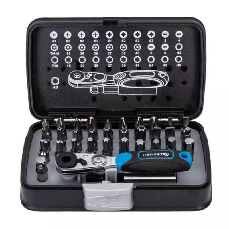 Набор бит с трещоткой Hogert HT1R460 на 33 предмета — это практичный и универсальный комплект для выполнения точных крепёжных работ. Подходит для использования в домашнем хозяйстве, мастерской, автосервисе или при сборке мебели. Наличие разнообразных наконечников PH, PZ, SL, HEX и Torx делает этот набор идеальным для работы с различными типами крепежа. Оснащён трещоткой с посадочным квадратом 1/4", благодаря чему обеспечивается удобное и быстрое завинчивание и отвинчивание элементов. Преимущества: В набор входит 33 элемента, включая самые востребованные виды бит Совместим с большинством ручных и механических инструментов Длина бит 75 мм позволяет работать в труднодоступных местах Качественная сталь S2 обеспечивает прочность и износостойкость Удобная трещотка ускоряет процесс работы Внутренний шестигранный привод обеспечивает надёжное соединение Компактная пластиковая упаковка удобна для хранения и транспортировки Набор не содержит ударных и магнитных бит, что снижает вероятность повреждения крепежа в деликатных задачах Вес комплекта всего 380 грамм, что удобно для переноски Технические характеристики: Тип — набор бит Тип бит — PH, PZ, SL, HEX, Torx Наконечники — PH1, PH2, PH3, PZ1, PZ2, PZ3, SL3.0, SL4.0, SL5.0, SL6.0, T10, T15, T20, T25, T27, T30, T40, H3, H4, H5, H6 Тип хвостовика — квадратный 1/4" Привод — внутренний шестигранник Длина бит — 75 мм Количество предметов — 33 Материал — сталь S2 Магнитный наконечник — нет Ударные биты — нет Цветная маркировка — нет Упаковка — пластик Вес — 380 г