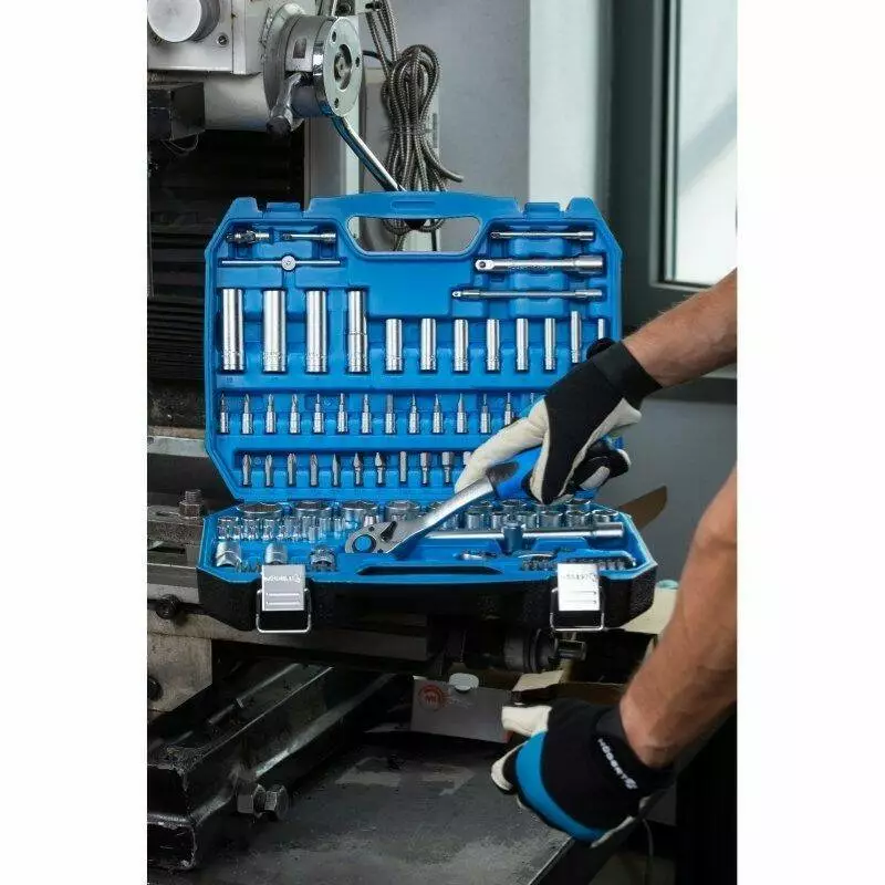 Пластиковый кейс надёжно фиксирует каждый элемент, защищая от ударов и пыли. Компактная форма позволяет легко хранить набор в багажнике автомобиля или мастерской.