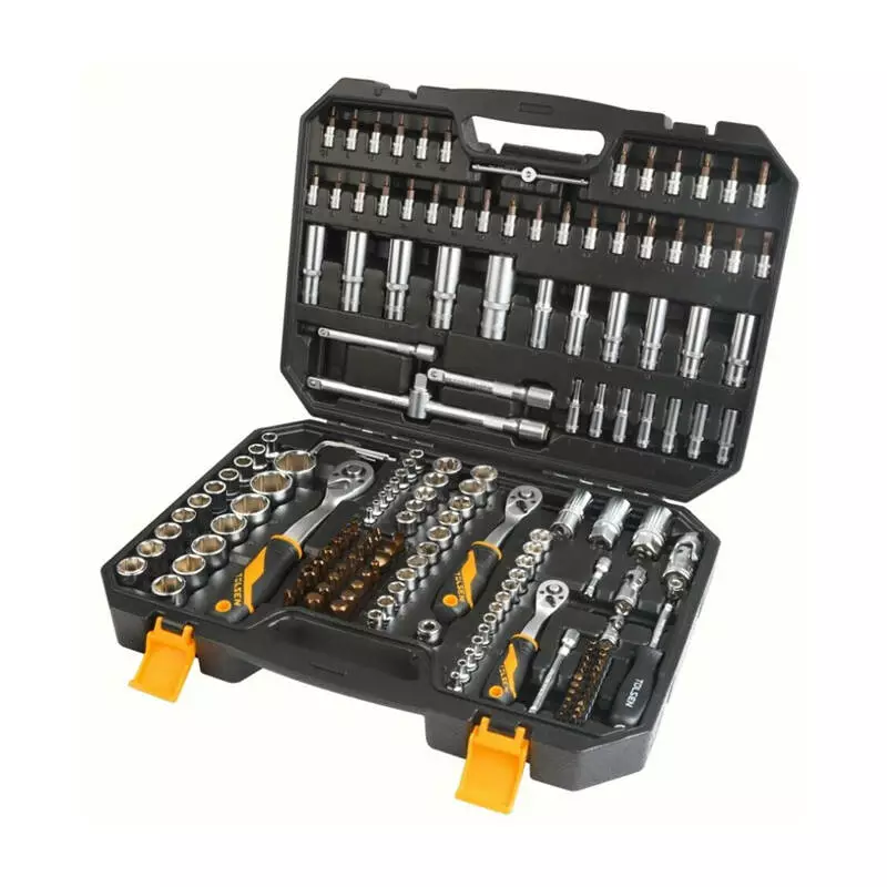 Набор включает всё необходимое для проведения слесарных, гаражных и ремонтных работ – от трещоток и свечных головок до бит и адаптеров. Система посадки 1/2", 1/4", 3/8" позволяет использовать инструменты с различными типами крепежа.