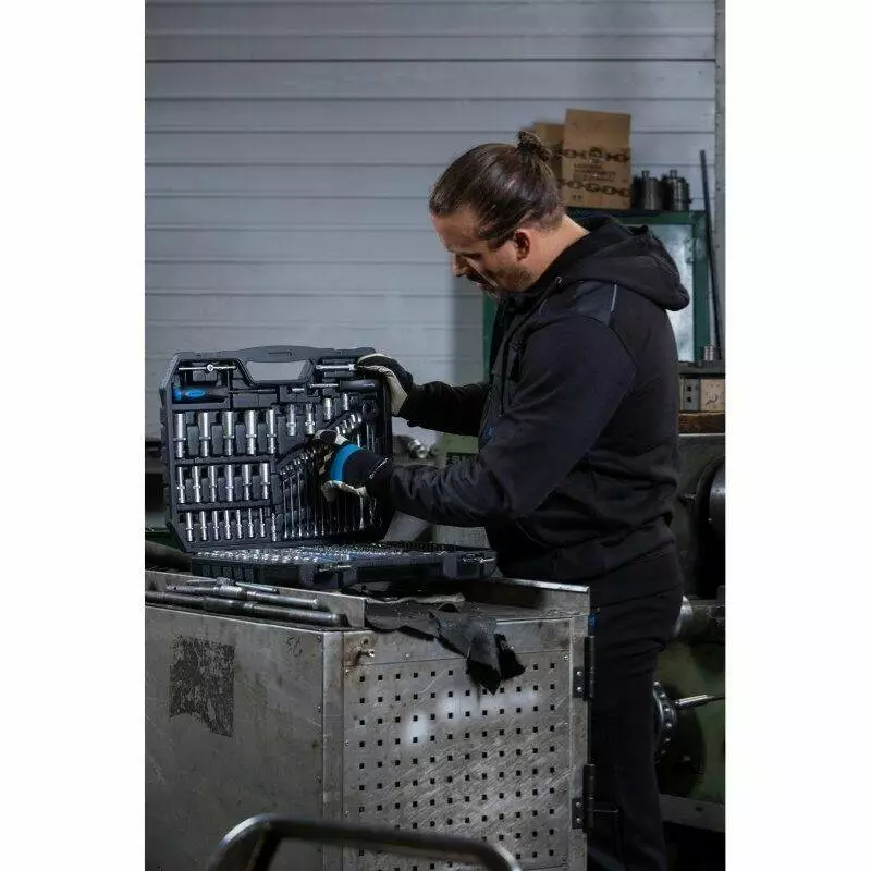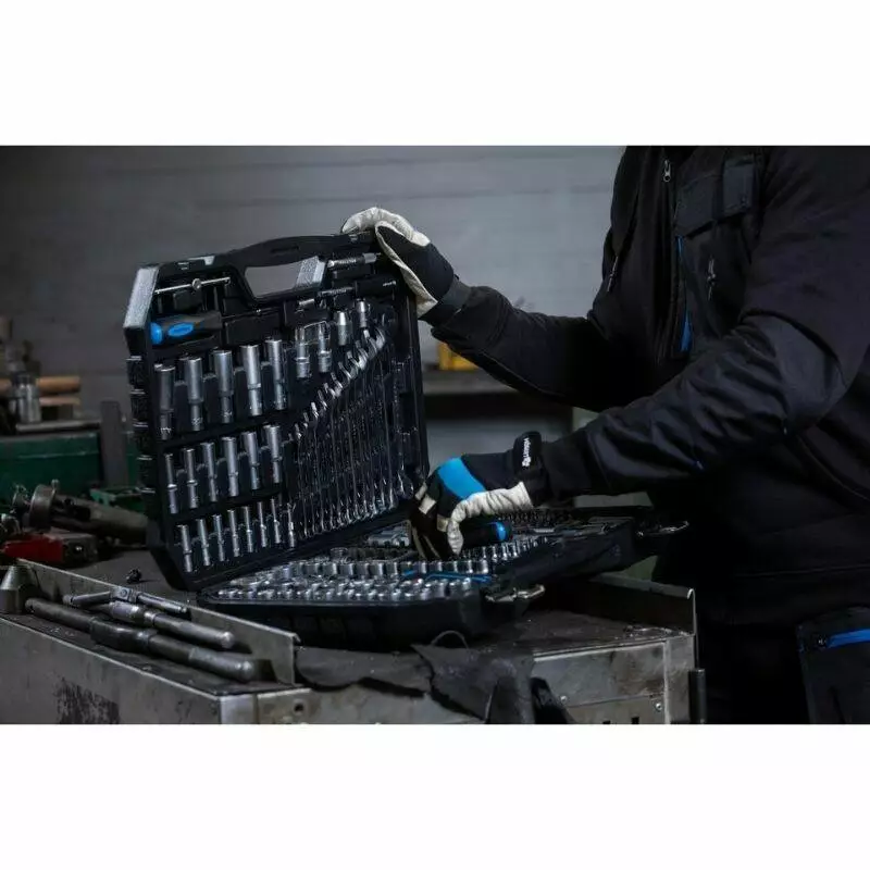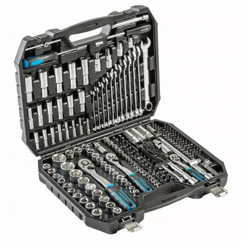 Комплект укомплектован всем необходимым для эффективной работы в гараже или на СТО. Включает торцевые головки, удлинители, комбинированные ключи с трещоткой, свечные головки, воротки, универсальные шарниры, биты и шестигранники. Все элементы промаркированы и удобно размещены в пластиковом кейсе.