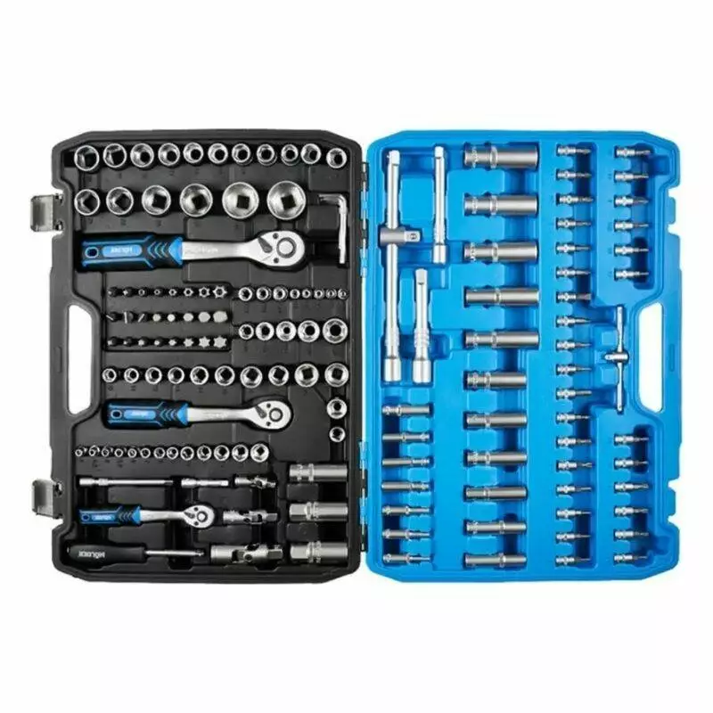 В наборе представлены трещотки 1/2", 1/4" и 3/8" с реверсом, стандартные и удлинённые торцевые головки, ключи Torx, биты различных форматов и переходники. Это позволяет использовать комплект для работы с разными типами крепежа и быстро справляться даже со сложными ремонтами.