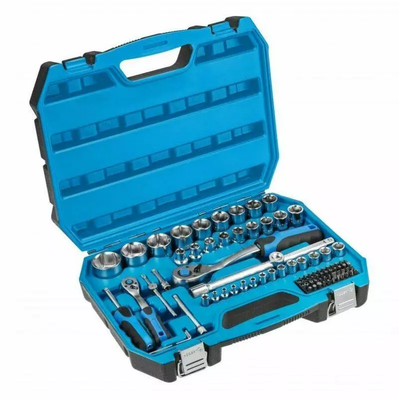 Трещотки с 72 зубцами обеспечивают плавный ход, а кнопочный механизм фиксации упрощает замену головок. Вес набора составляет 5,42 кг – оптимально для мобильной работы и стационарного использования.