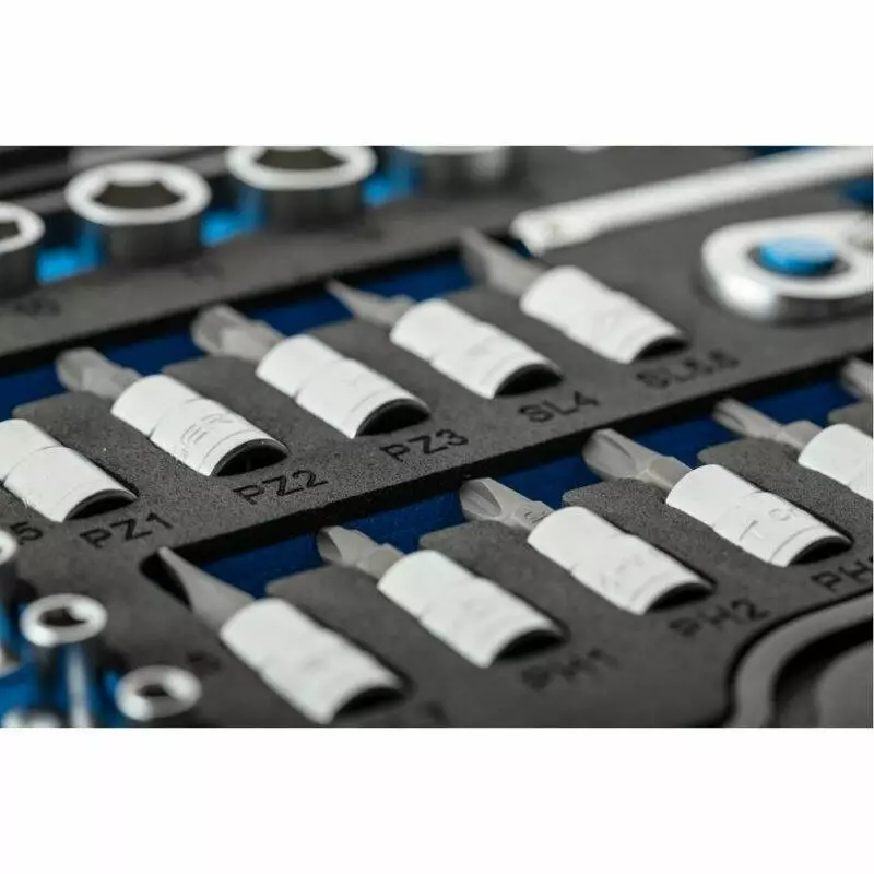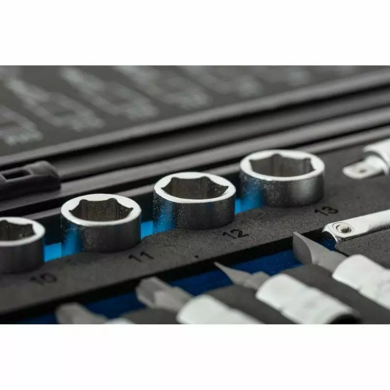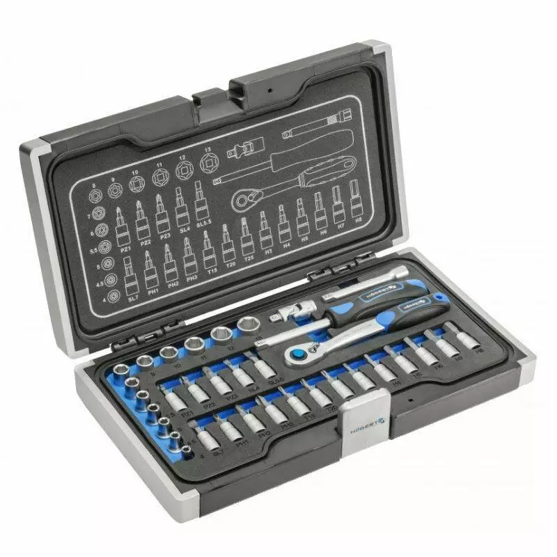 В наборе нет лишних элементов — только наиболее востребованные головки, шарниры и биты. Подходит как для гаража, так и для работы на выезде.