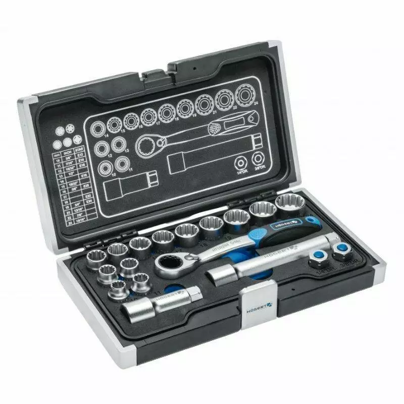 Комплектация включает 13 сквозных торцевых головок размером от 10 до 24 мм, две трещотки — на 1/4" и 3/8", сквозную трещотку 19 мм, переходник, а также удлинители 80 и 150 мм. Такой состав позволяет быстро и удобно работать с различными крепежами в автомобиле и оборудовании.