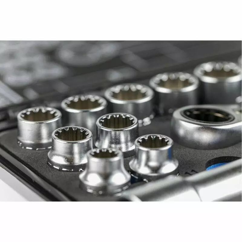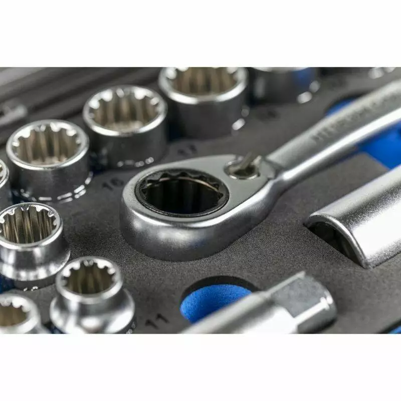 Все элементы набора изготовлены из хром-ванадиевой и хром-молибденовой стали (CrV, CrMo), что гарантирует высокую прочность, устойчивость к износу и длительный срок службы даже при интенсивном использовании.