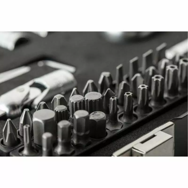 В набор входят торцевые 6-гранные головки на 1/4" в диапазоне от 4 до 13 мм, множество бит и адаптеров, кардан, удлинители, отвертки и шестигранные ключи. Такой состав инструментов позволяет выполнять широкий спектр задач — от обслуживания автомобиля до мелкого ремонта в доме.