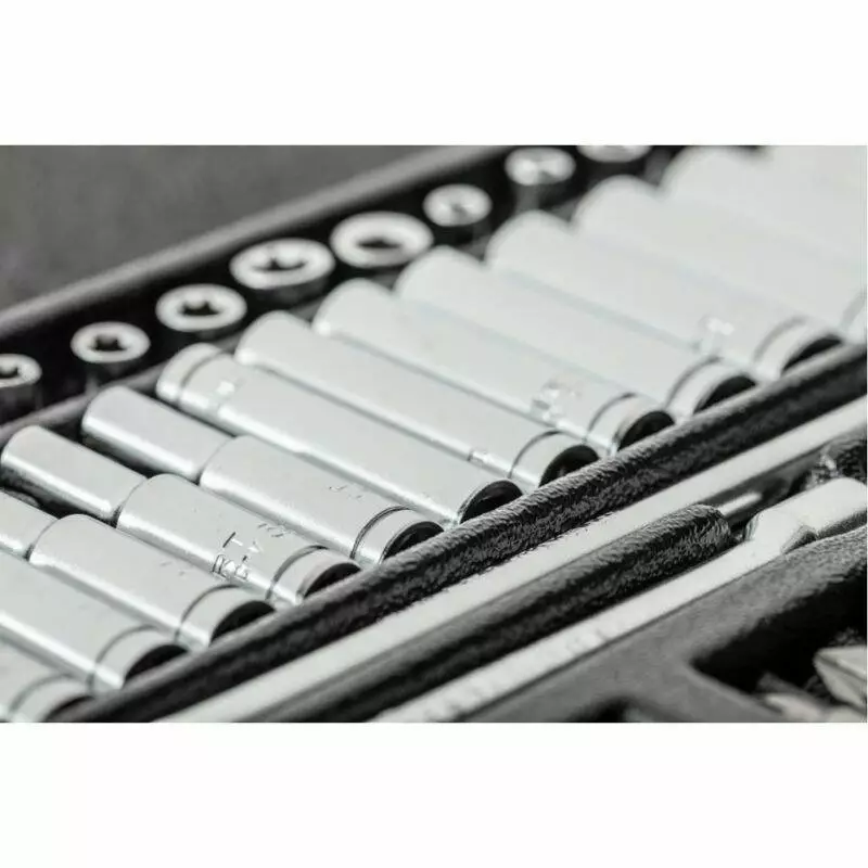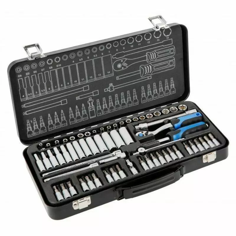 В наборе представлены стандартные и удлинённые шестигранные головки от 4 до 14 мм, головки Torx E4–E10, широкий набор бит для самых разных видов крепежа, а также карданные соединения, удлинители разной длины и удобный Т-образный вороток. Комплект позволяет эффективно выполнять слесарные, ремонтные и монтажные работы с автомобильными узлами, оборудованием и деталями.