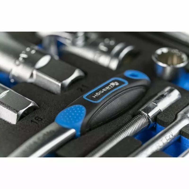 В наборе присутствуют трещотки, воротки, отвертки и гибкие удлинители, что позволяет легко производить ремонтные работы даже в труднодоступных местах автомобиля или оборудования.