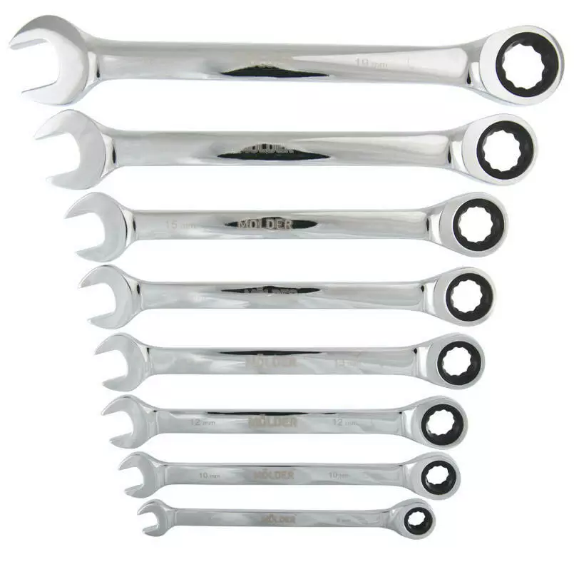 Набор комбинированных ключей Molder MT56108 представляют из себя надежный инструмент, который может быть использован во всех сферах деятельности, где это необходимо. Основа набора комбинированных ключей Molder MT56108 – это хромованадиевая сталь, которая покрыта никель-хромированным покрытием. Ключ имеет 72 зубцовой механизм. Технический стандарт DIN 3113.