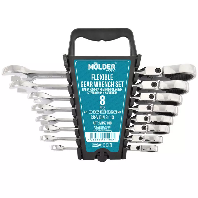 Набор комбинированных ключей Molder MT57108 представляют из себя надежный инструмент, который может быть использован во всех сферах деятельности, где это необходимо. Основа набора комбинированных ключей Molder MT57108 – это хромованадиевая сталь, которая покрыта никель-хромированным покрытием. Ключ имеет 72 зубцовой механизм. Технический стандарт DIN 3113.