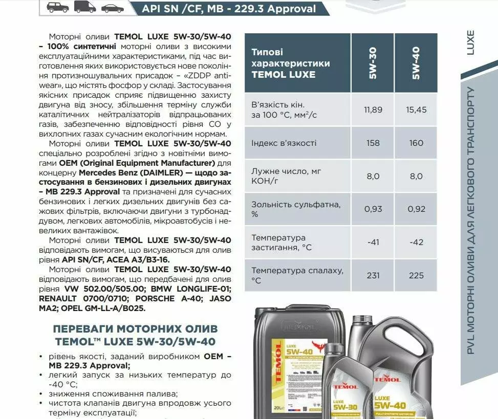 Олива TEMOL Luxe 5W-30 API SN,API CF,АСЕА A3/B4-16 (4 л)