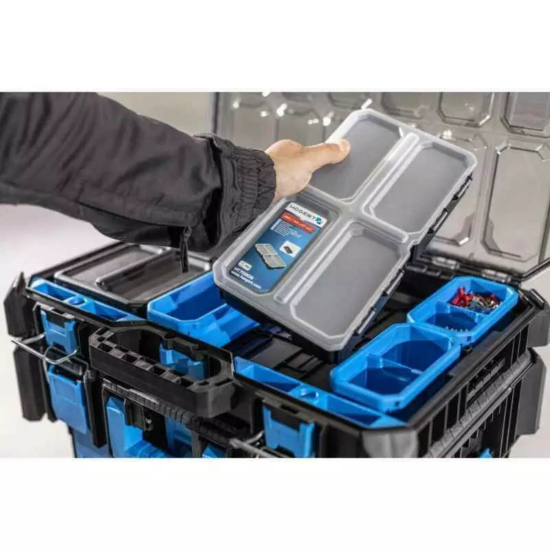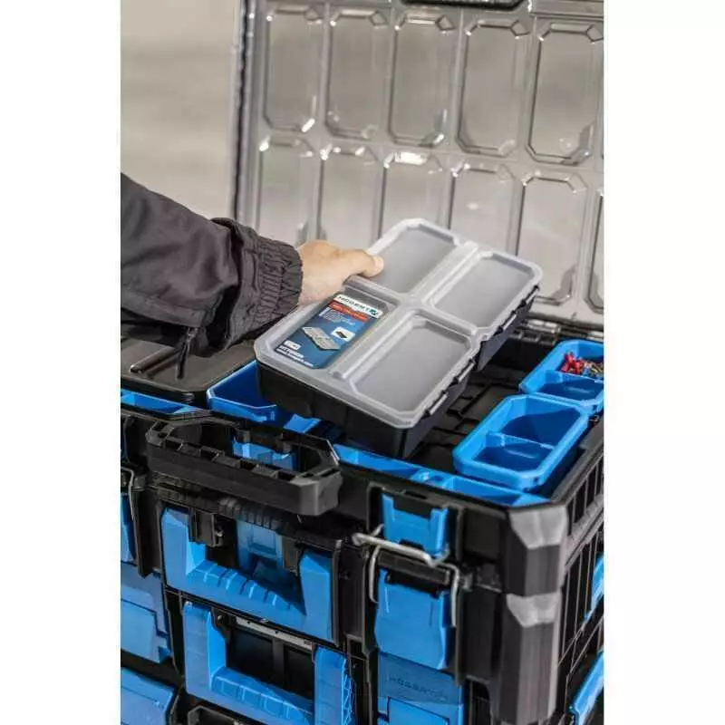 Благодаря модульной конструкции органайзер легко сочетать с другими элементами той же линейки для увеличения объема хранения. Компактные размеры позволяют удобно размещать органайзер в мастерской, гараже, автомобиле или дома. Пластиковая конструкция проста в уходе – достаточно протереть влажной тряпкой.