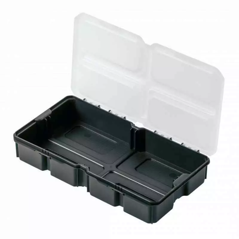 Органайзер имеет четыре отделения с отдельными перегородками. Прозрачная крышка плотно закрывается, защищая содержимое от пыли и случайного рассыпания. Все элементы выполнены из прочного пластика, который не деформируется при нагрузках. Компактные габариты позволяют брать органайзер с собой на выездные работы или хранить на полке с инструментами.