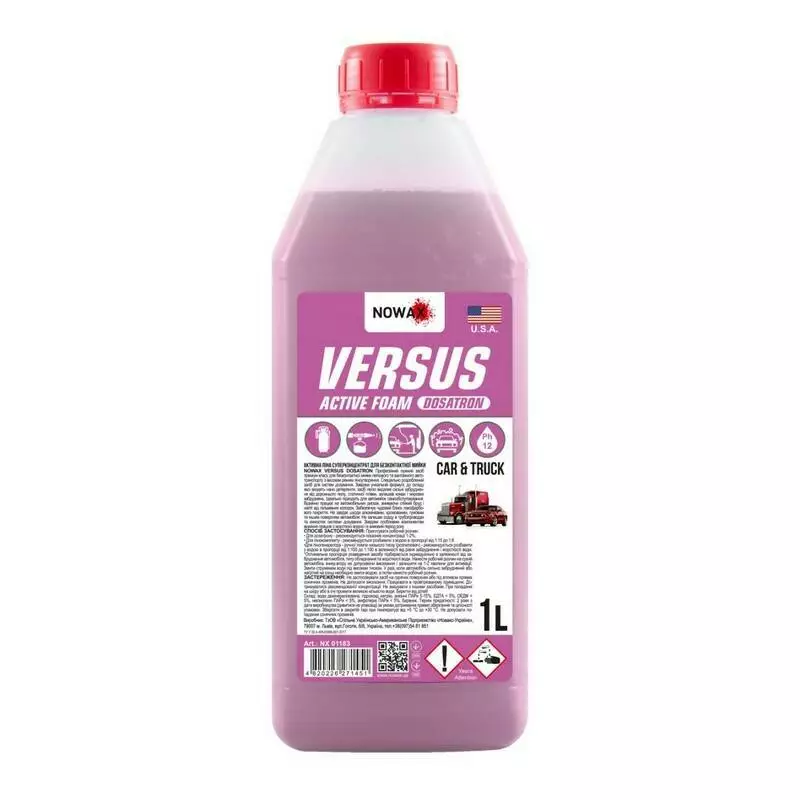 Nowax Versus Dosatron Active Foam Профессиональный щелочной агент премиум класса для бесконтактной мойки легковых и грузовых автомобилей с высоким уровнем пенообразования. Специально разработан для дозированной системы. Благодаря уникальной формуле, которая включает в себя нано-моющие средства, она легко удаляет сильную грязь, состоящую из дорожной пыли, статической пленки, остатков насекомых и жировых загрязнений.