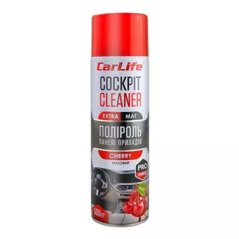 Аэрозольное средство, предназначенное для очистки и полировки приборной панели и других пластиковых элементов салона. Обладает отличными проникающими свойствами и эффективно удаляет даже мельчайшую пыль из текстуры пластика и повреждений, таких как царапины или сколы, а специальный матирующий компонент данные повреждения скрывает, делая поверхность визуально гладкой. Также, средство позволяет избавиться от излишнего блеска приборной панели, тем самым устраняя блики с лобового стекла для максимально комфортного управления автомобилем. Полироль CarLife Cockpit Cleaner EXTRA MAT вишня CF529 500мл не содержит в составе подкрашивающих компонентов и универсально подходит для пластиковых элементов любых цветов и оттенков.
