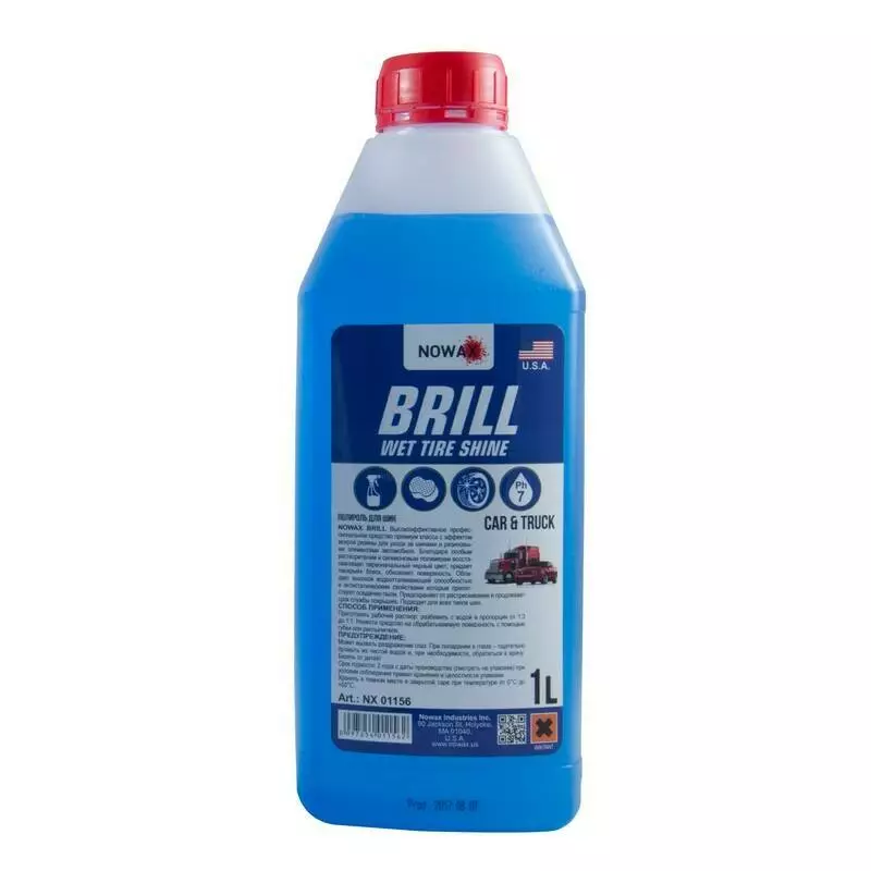 NOWAX BRILL - Высокоэффективное профессиональное средство премиум класса с эффектом мокрой резины для ухода за шинами и резиновыми элементами автомобиля. Благодаря особым растворителям и силиконовым полимерам восстанавливает первоначальный черный цвет, придает «мокрый» блеск, обновляет поверхность. Обладает высокой водоотталкивающей способностью и антистатическими свойствами которые препятствуют оседанию пыли. Предохраняет от растрескивания и продлевает срок службы покрышек. Подходит для всех типов шин.