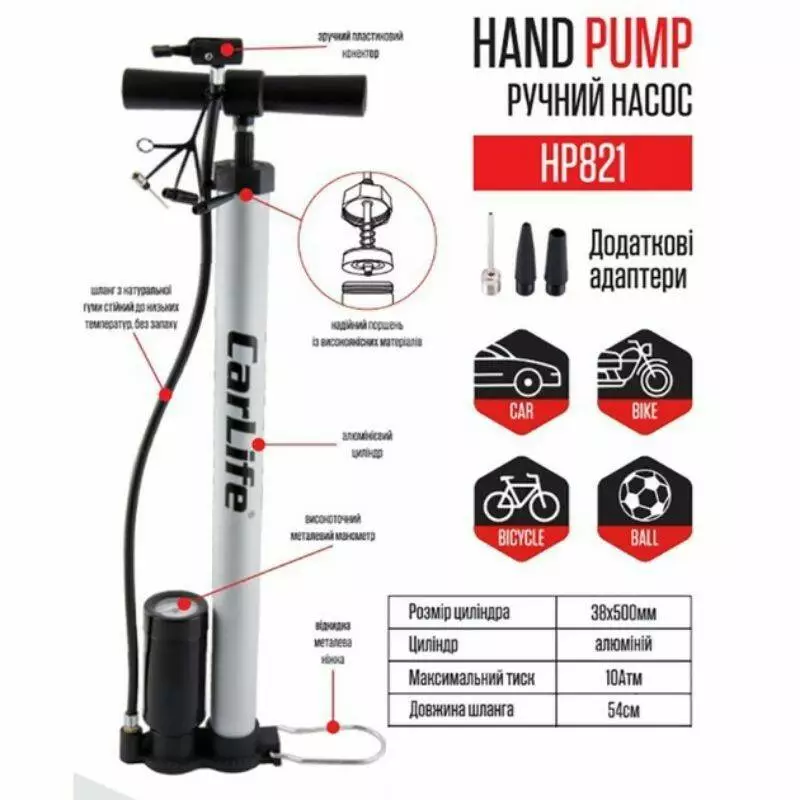 Нормальное давление в шинах очень важный показатель, для удобной и безопасной езды. Постоянная проверка давление и накачка шин, не только вас обезопасит, но и предотвратит преждевременный износ шин, улучшит сцепление с дорогой, уменьшит расход топлива. В этом вам поможет одноцилиндровый ручной насос CarLife HP821 - незаменимая вещь не только в вашем автомобиле, но и в доме.
