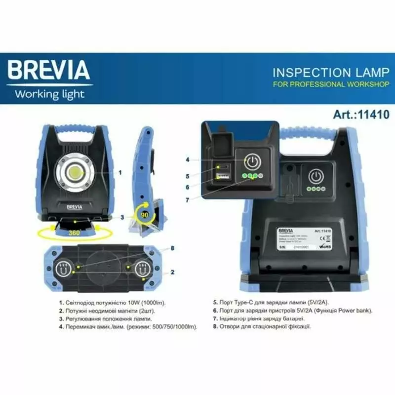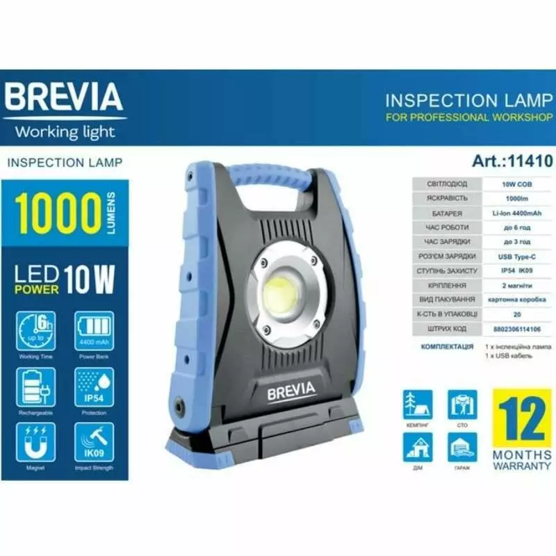 Профессиональная инспекционная лампа Brevia LED с датчиком движения 10W COB, 1000lm, 4400mAh, Power