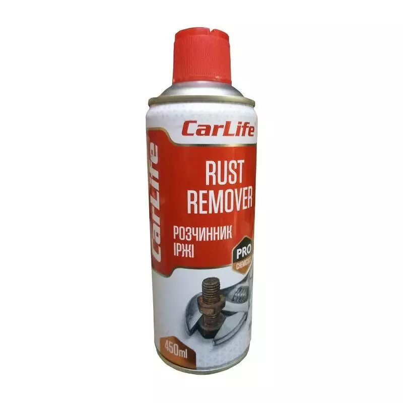 Растворитель ржавчины (жидкий ключ) 450 мл CarLife RUST REMOVER (CF451) – профессиональное проникающее средство для быстрого разъединения ржавых узлов, заклиненных резьбовых и цилиндрических соединений. Легко и без повреждений проникает и разъединяет резьбовые соединения: заржавевшие болты, гайки, винты, фитинги и тому подобное. Образует защитную пленку на поверхности металла и предотвращает появление ржавчины. Обеспечивает превосходное смазывание в закрытых и труднодоступных местах, устраняет скрип, значительно уменьшает износ и трение механизмов. Вытесняет влагу с поверхности и образует водоотталкивающую пленку, препятствующую коррозии. Рекомендуется для применения на станциях технического обслуживания, мастерских, домашнем хозяйстве и производстве. Средство нейтрально к резиновым и пластиковых деталям, дереву, лакокрасочному покрытию, хромированным поверхностям и металлам.