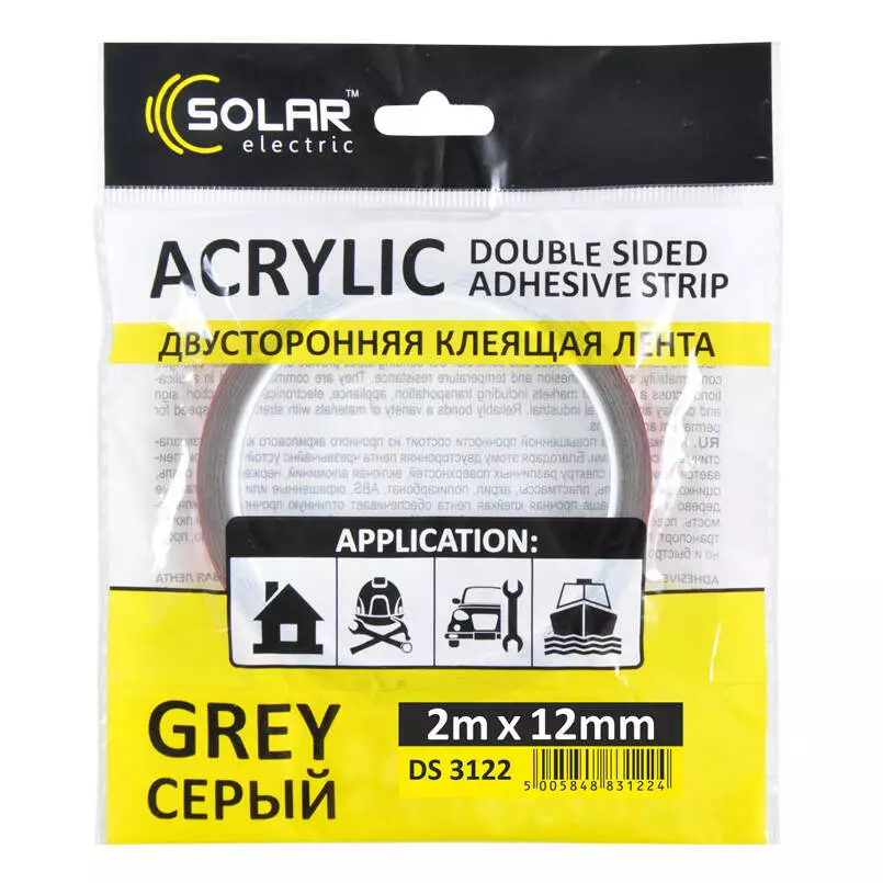 Скотч двусторонний SOLAR (DS3122) серый ACRYLIC (VHB) 2м x 12мм