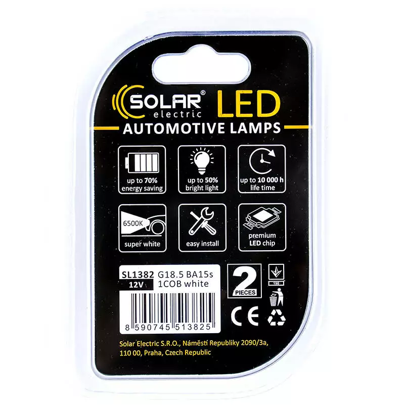 Работают лампы SOLAR G18.5 BA15s 12V 1COB white SL1382 (2 шт.) от напряжения 12 Вольт и универсально подходят для использования в любых легковых транспортных средств. Благодаря невероятно белому свету с цветовой температурой 6500 К лампы обеспечивают великолепную видимость даже в яркий, солнечный день и повышают уровень безопасности во время движения по дорогам общего пользования.