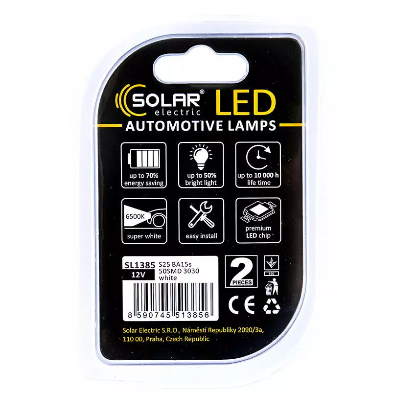 Работают лампы SOLAR S25 BA15s 12V 50SMD 3030 white SL1385 (2 шт.) от напряжения 12 Вольт и универсально подходят для использования в любых легковых транспортных средствах. Благодаря невероятно белому свету с цветовой температурой 6500 К лампы обеспечивают великолепную видимость даже в яркий, солнечный день и повышают уровень безопасности во время движения по дорогам общего пользования.